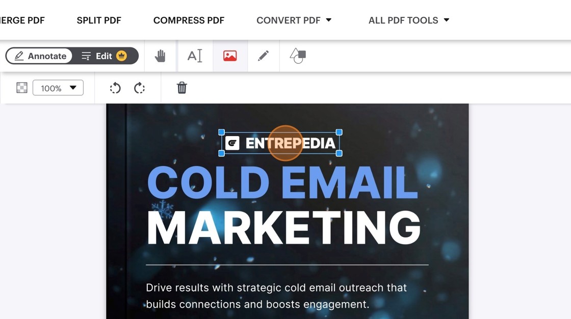 On the top toolbar, click on the Image icon. Upload your logo from your computer. Once your logo is uploaded, it will appear on the PDF page.