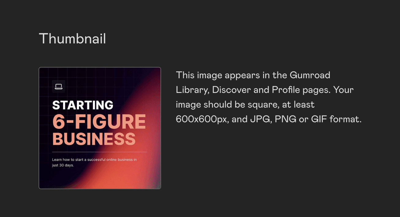 Thumbnail: Images should be square, at least 600x600 pixels and in JPG, PNG, or GIF format. This image appears in the Gumroad library, Discover, and Profile pages.