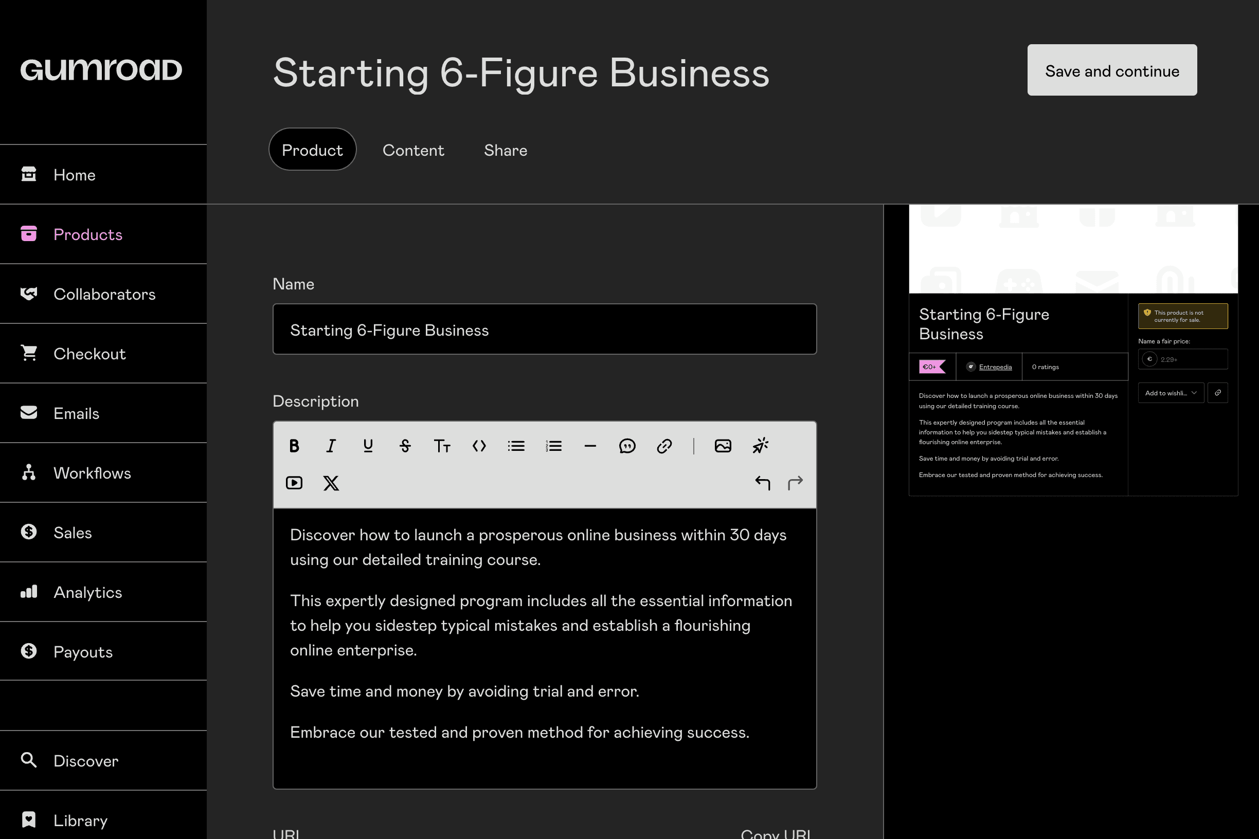 Also use relevant keywords for your product. For example, "ebook," "online courses", and "video courses". This will help your product show up in Gumroad and external search results.