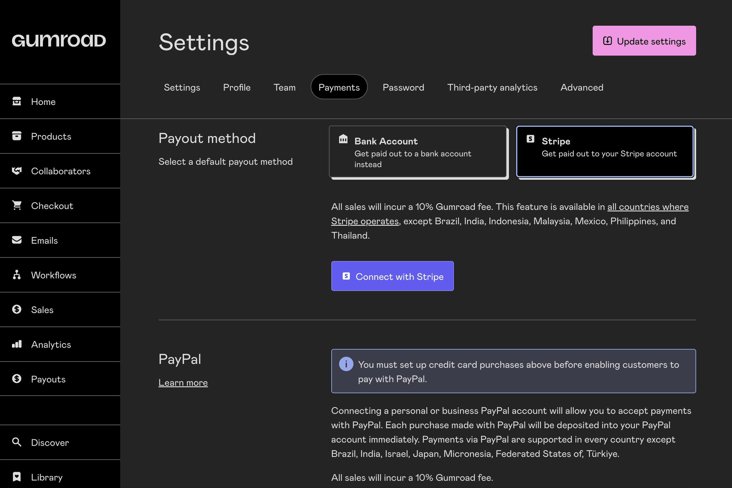 Set up payment information: To receive payments, link your Stripe, PayPal or bank account under the settings tab. Gumroad's integration with Stripe and PayPal services makes transactions smooth and secure.