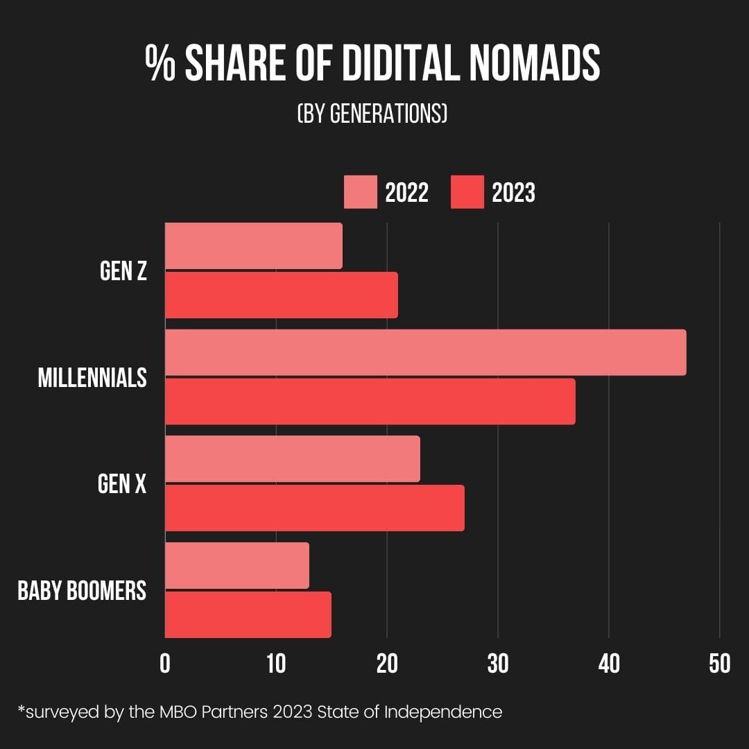 In 2023, there are 17.3 million American digital nomads, representing a 131% increase from 7.3 million in 2019.