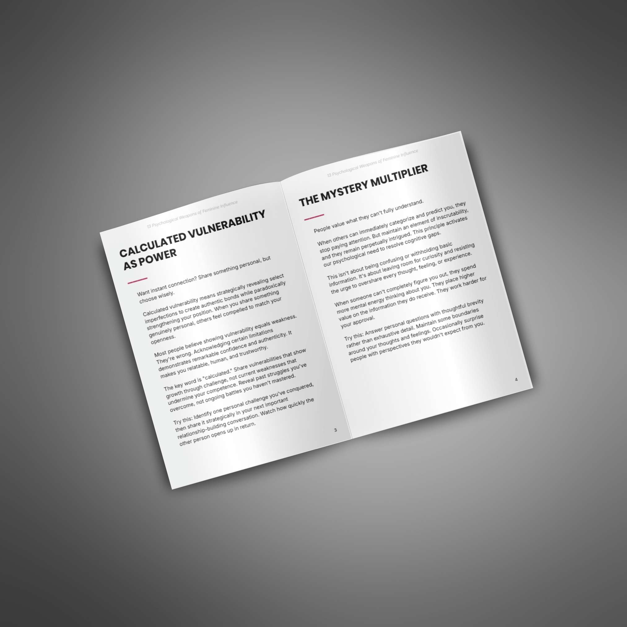 This listicle is a ready-to-use content asset designed to quickly educate, engage, and qualify your audience with skimmable, high-value insights. It’s perfect for resellers who want to offer a compelling lead magnet that introduces feminine influence in a simple, accessible way. With a clear narrative and 13 powerful psychological tools, it shows your customers how to understand and embody influence using subtle, effective techniques rooted in human behavior.