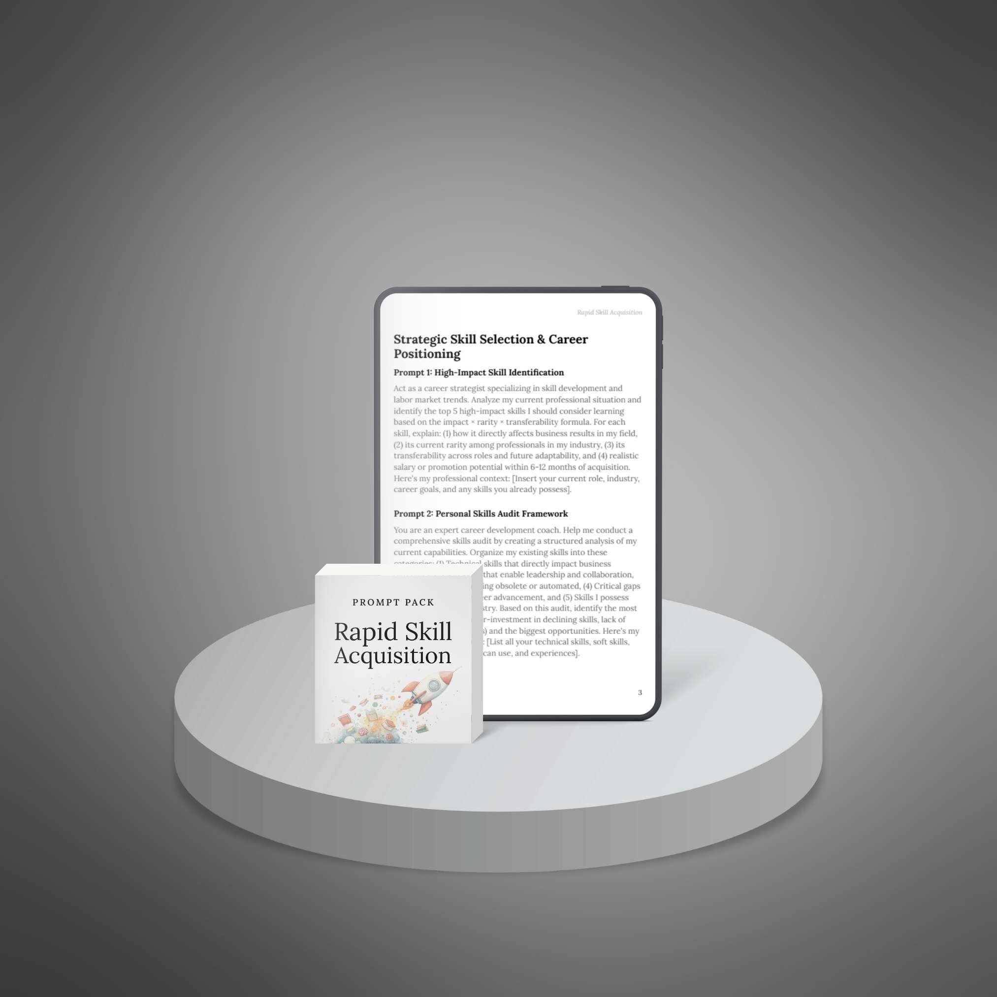 This prompt pack helps your customers use AI to learn new skills faster and more effectively. It provides structured prompts that guide them through choosing the right skill, building a clear learning plan, and practicing with purpose to reach real results in less time.