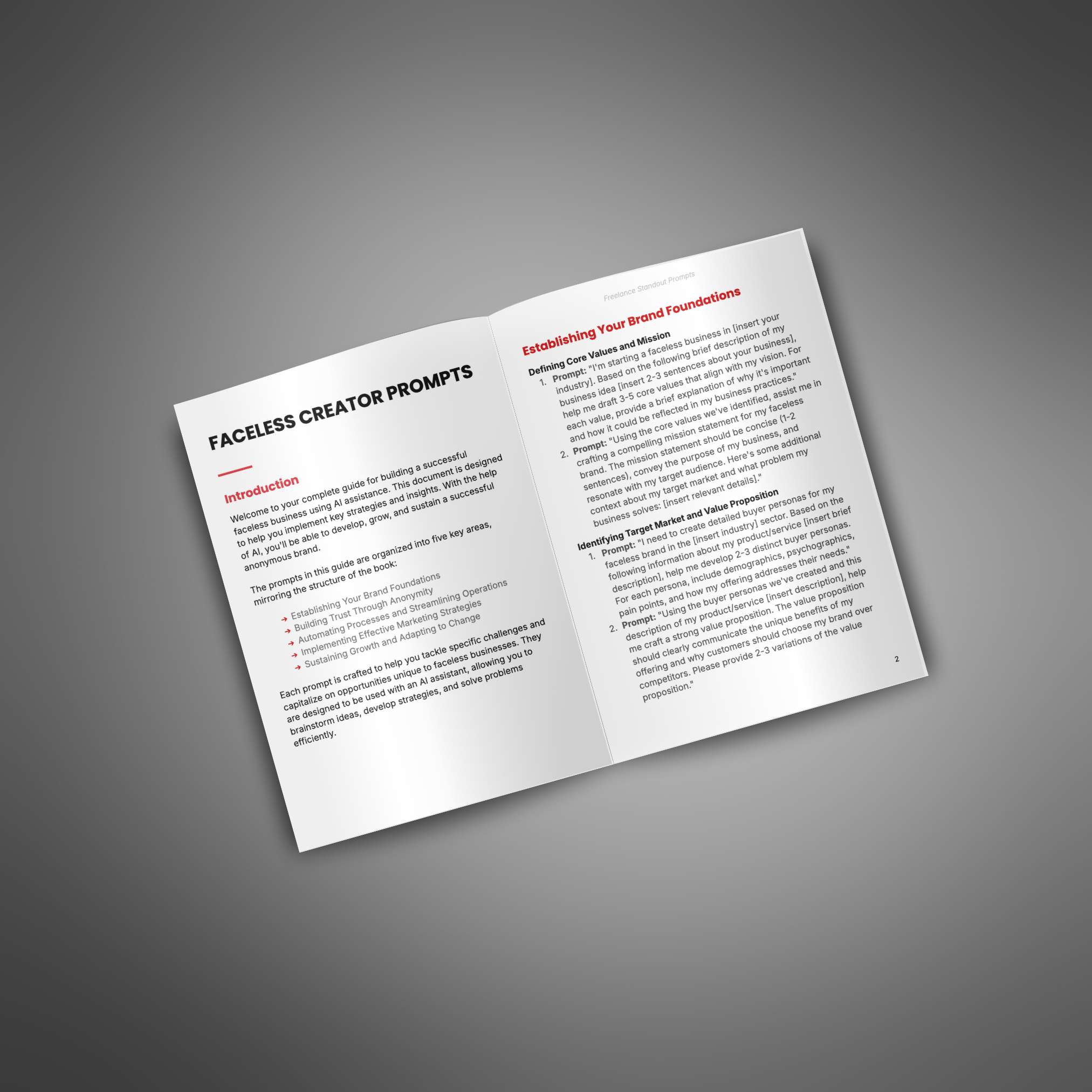 Prompt pack designed to help your customers build a faceless brand by using AI to streamline operations, develop strong branding, and grow their business without relying on personal identity.