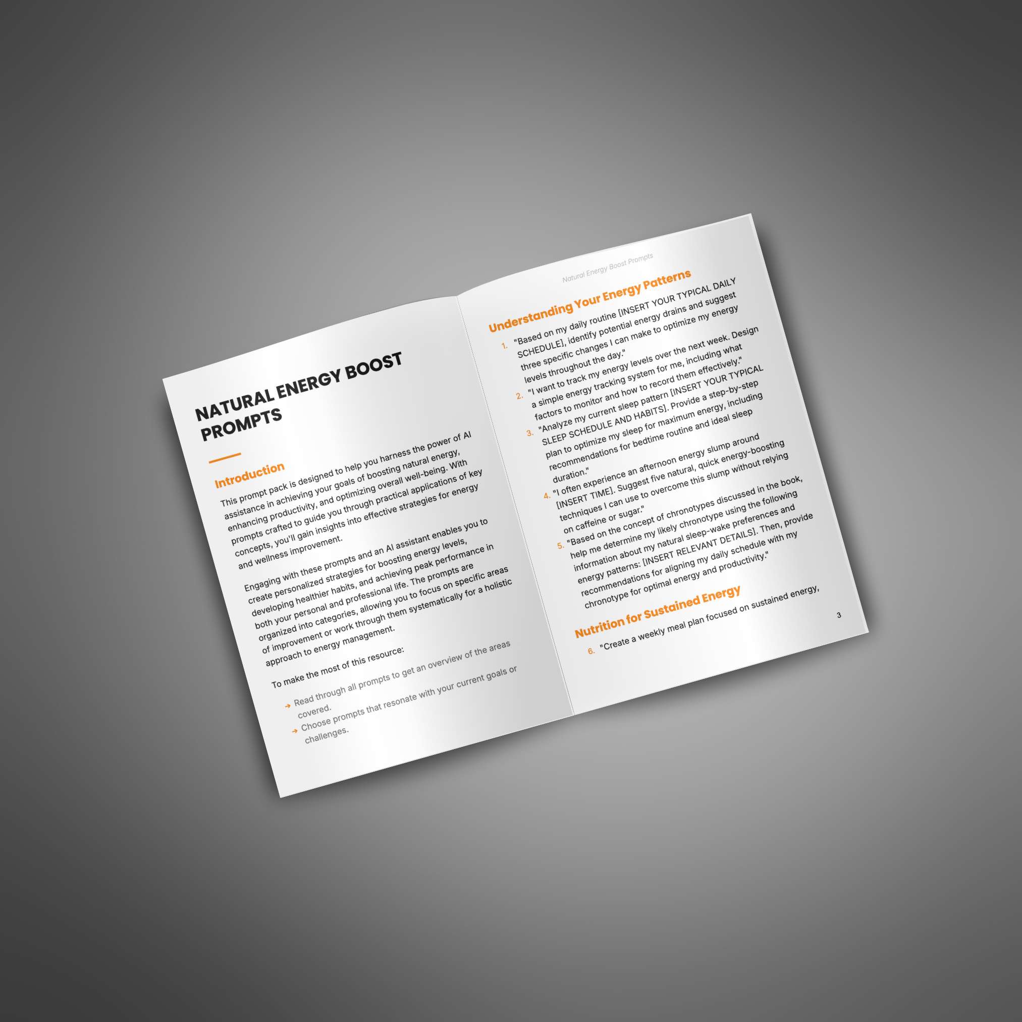Prompt pack designed to help your customers use AI to naturally boost energy levels by focusing on nutrition, exercise, sleep, and stress management.