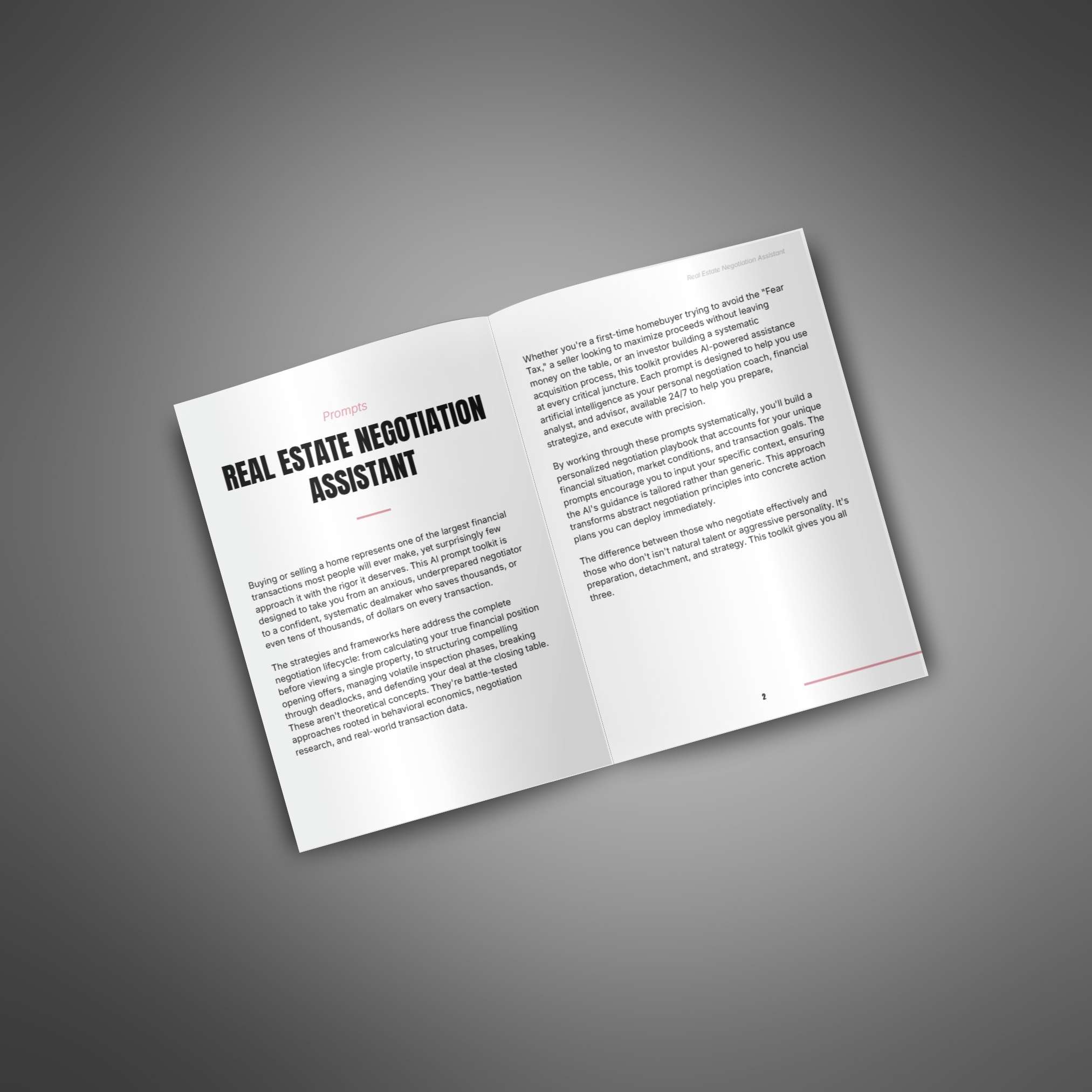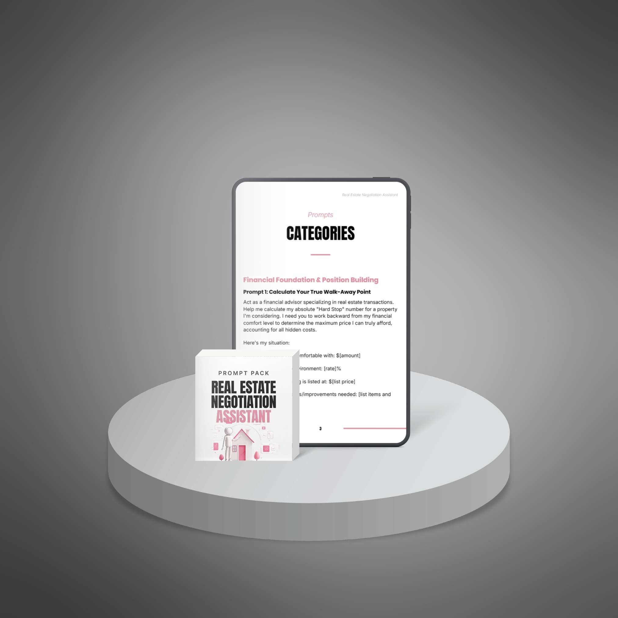 Prompt pack designed to help your customers use AI to confidently plan property deals, negotiate better terms, and make smarter real estate decisions.