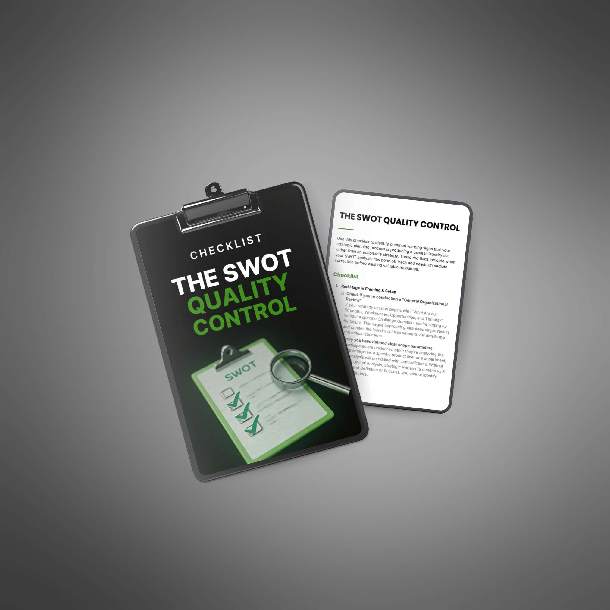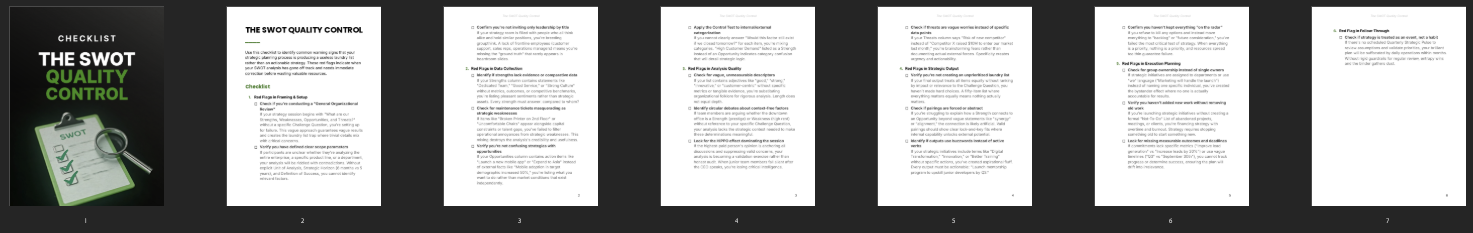 Checklist to guide your customers through reviewing their SWOT analysis to uncover clear, actionable insights for improving business decisions.