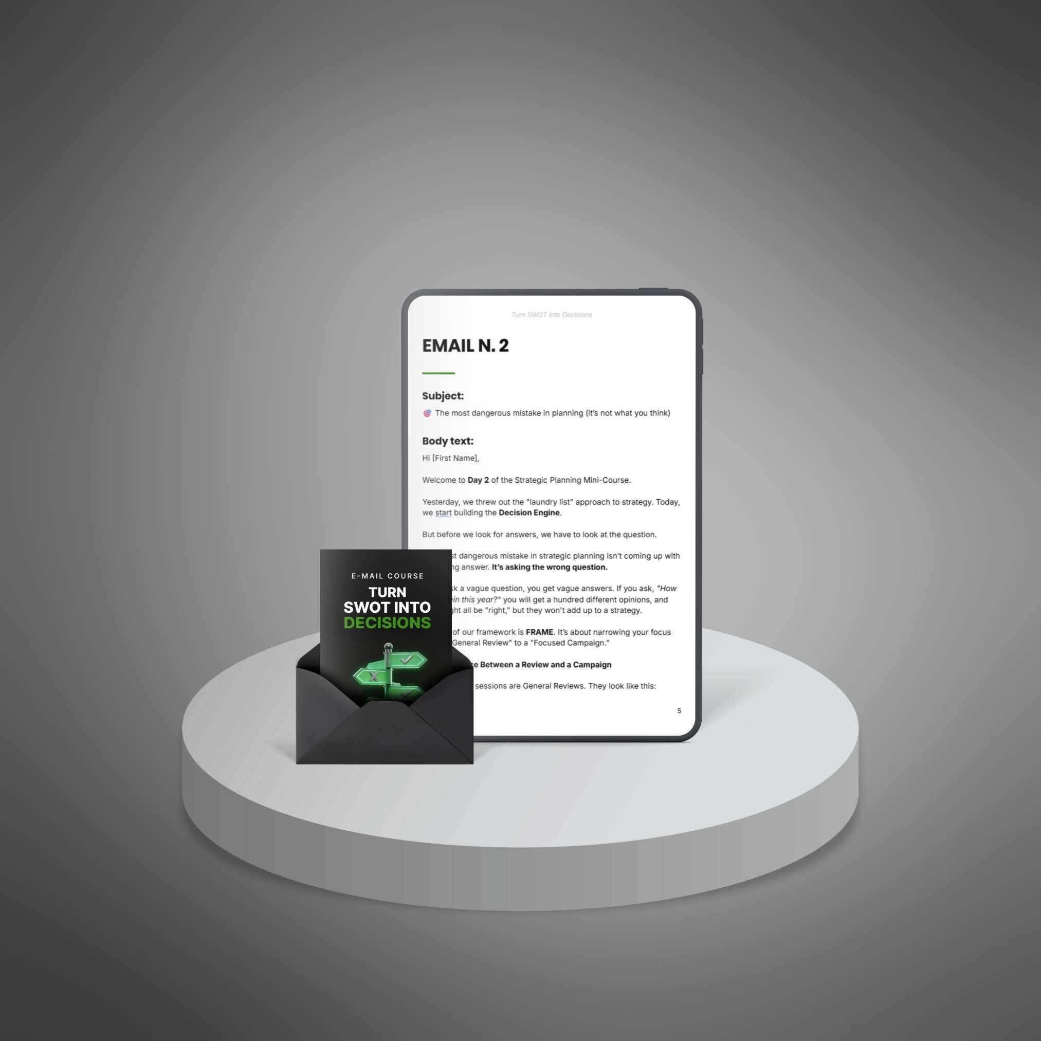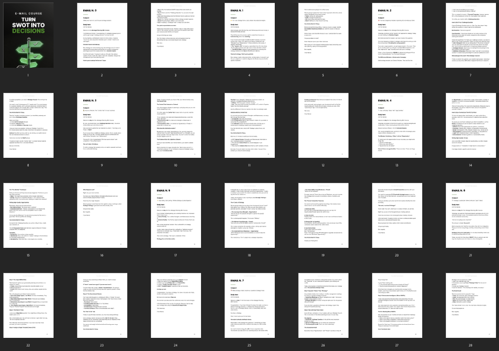 Email course designed to help you guide your customers through turning SWOT analysis into clear business decisions while upselling your offering.