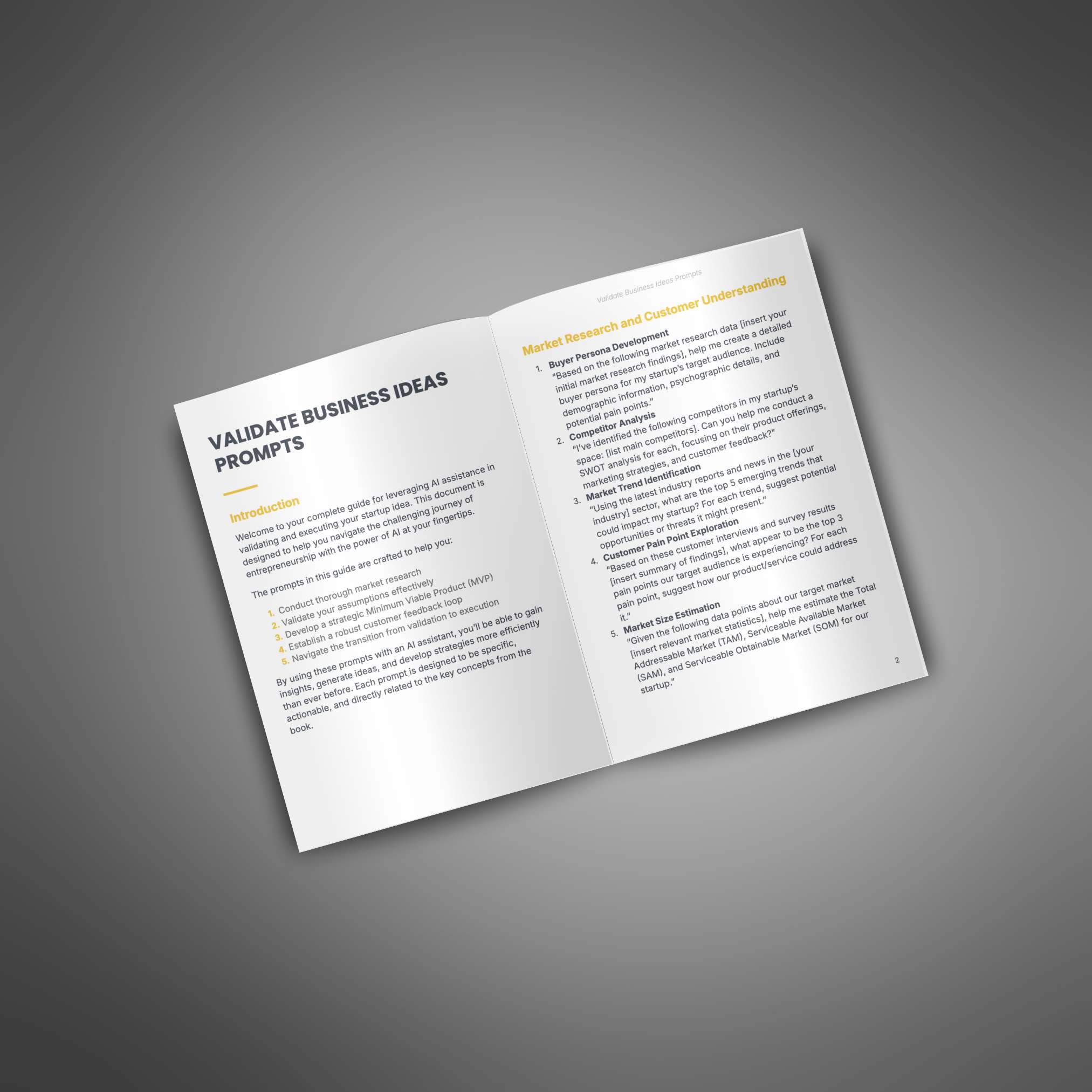 Prompt pack designed to help your customers use AI to validate business ideas, conduct market research, and develop a Minimum Viable Product for their startup journey.